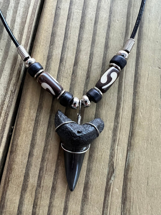 1 3/8 Inch Fossil Mako Shark Tooth Necklace with Black and Brown Bone Beads