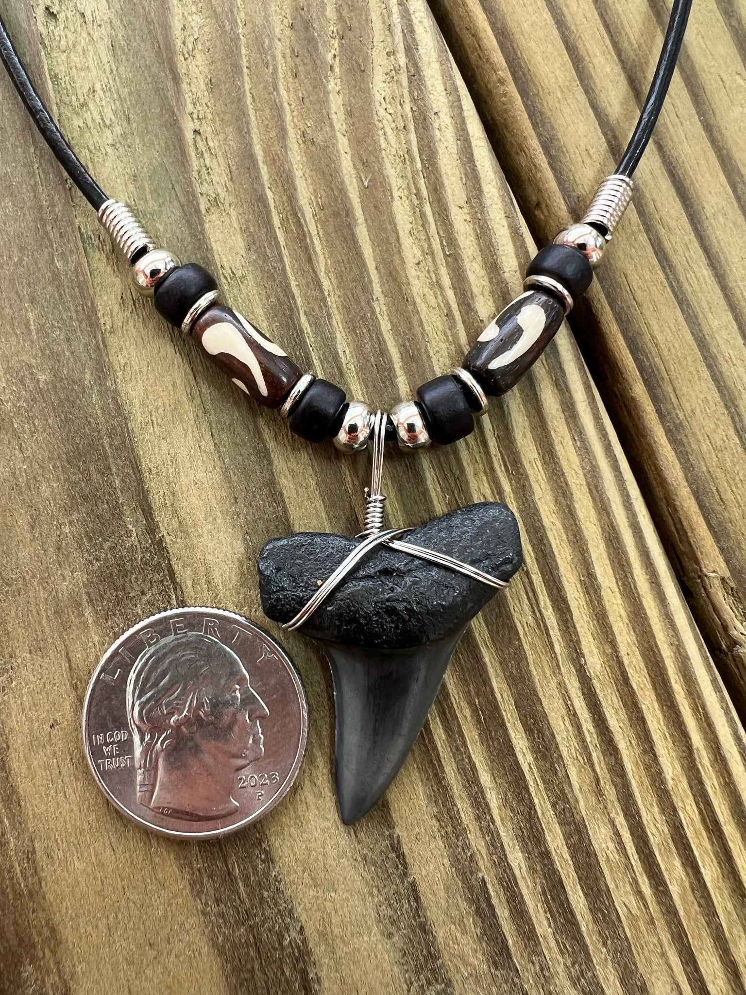 A genuine 1 1/2 inch fossilized Mako shark tooth wrapped in stainless steel wire and paired with bold black clay and brown bone beads. The dark enamel and rugged root create a striking balance of raw ocean power and refined craftsmanship. Perfect for collectors or anyone drawn to the wild beauty of prehistoric seas.