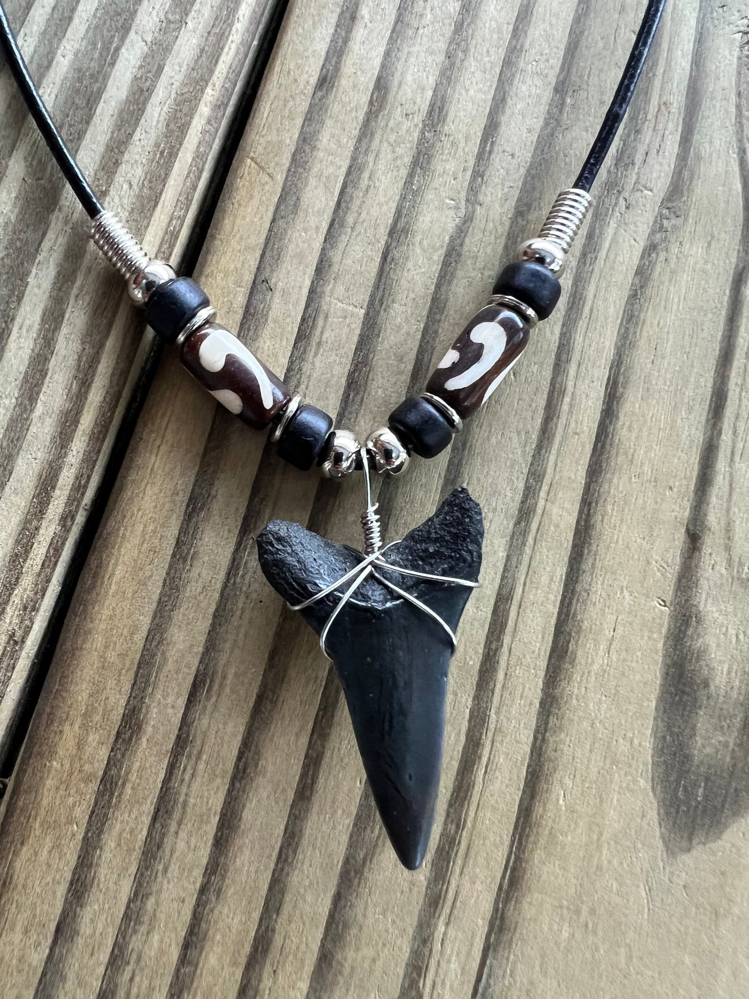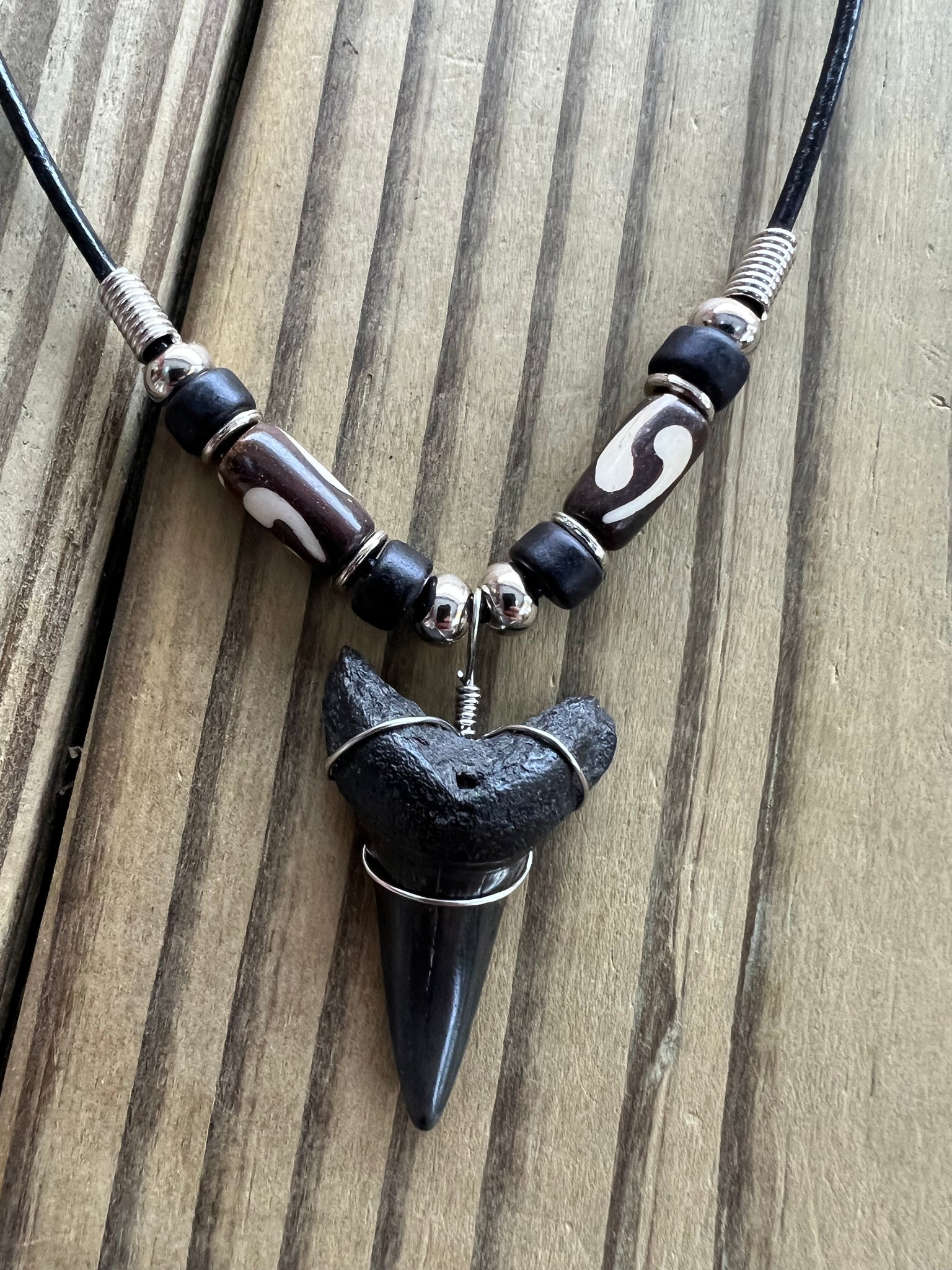 This handcrafted necklace showcases a 1 7/16 inch fossilized Mako shark tooth, a relic from prehistoric oceans. Wrapped in stainless steel wire, the dark enamel tooth hangs from a strand featuring black clay beads and a carved brown bone centerpiece. The bold design blends natural textures and metallic accents, creating a striking statement piece that embodies raw ocean energy and timeless craftsmanship.