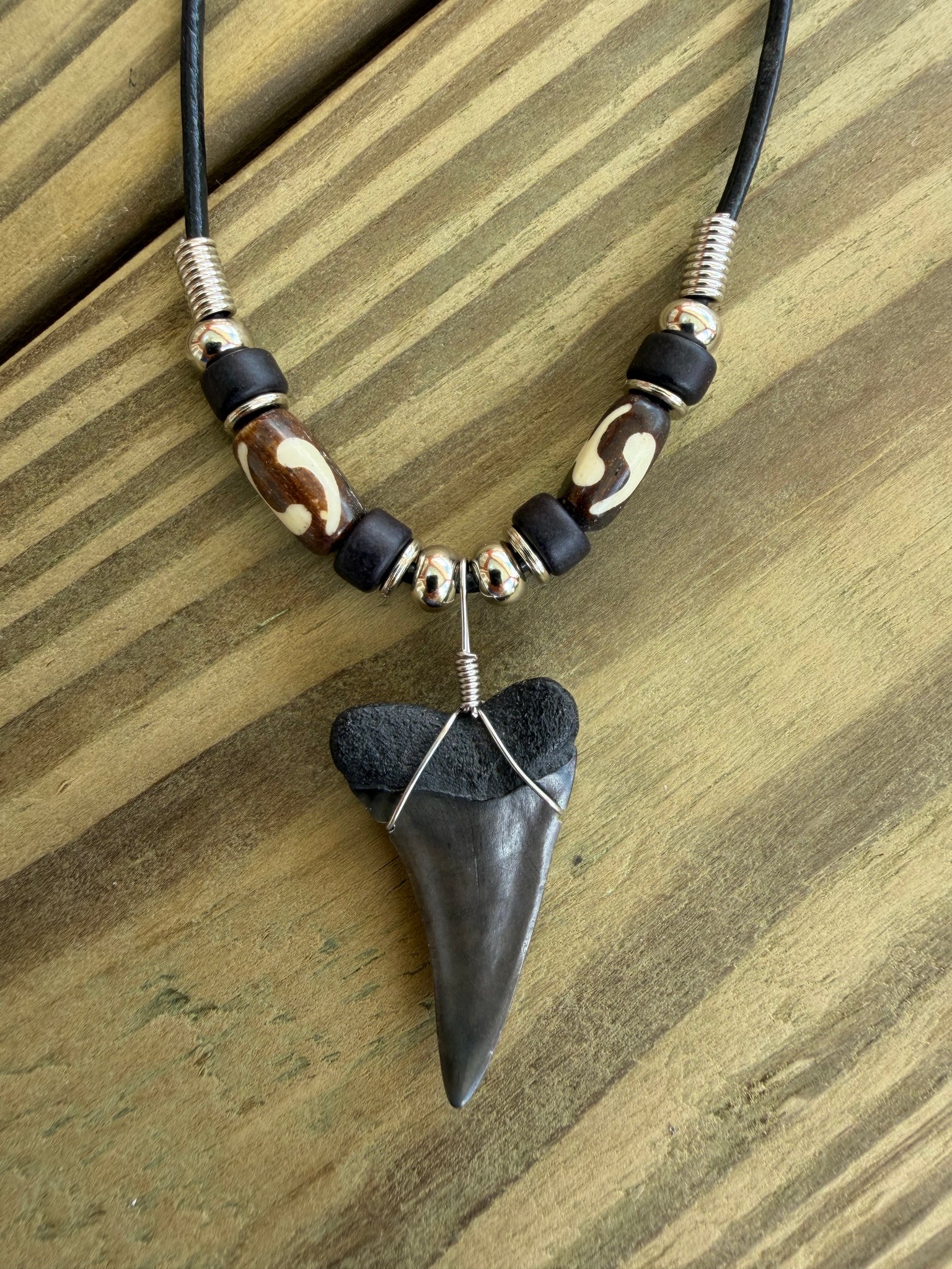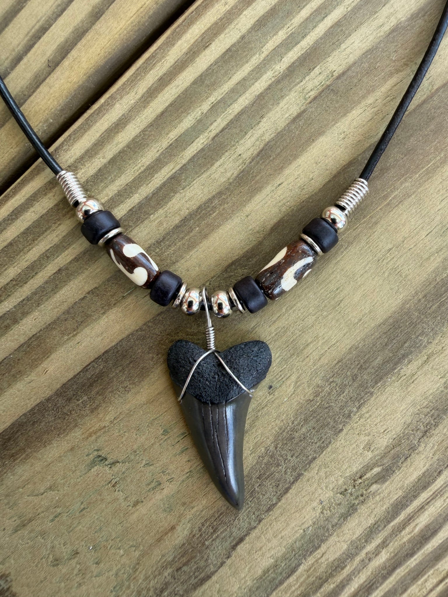 The necklace is finished with a durable black leather cord and metal clasp, making it comfortable for everyday wear. Each mako shark tooth necklace with bone beads is unique, as fossil teeth naturally vary in shape, color, and character.