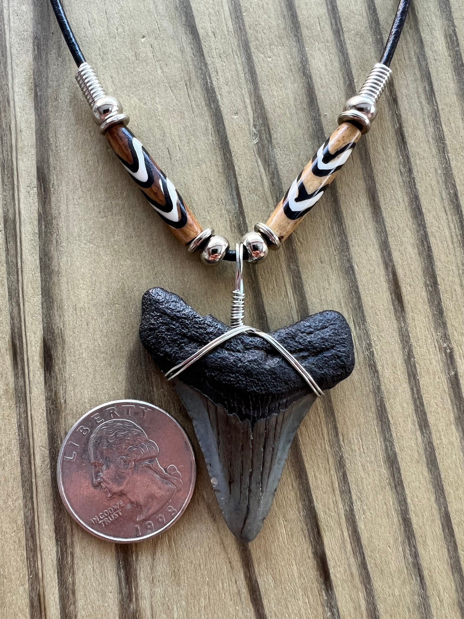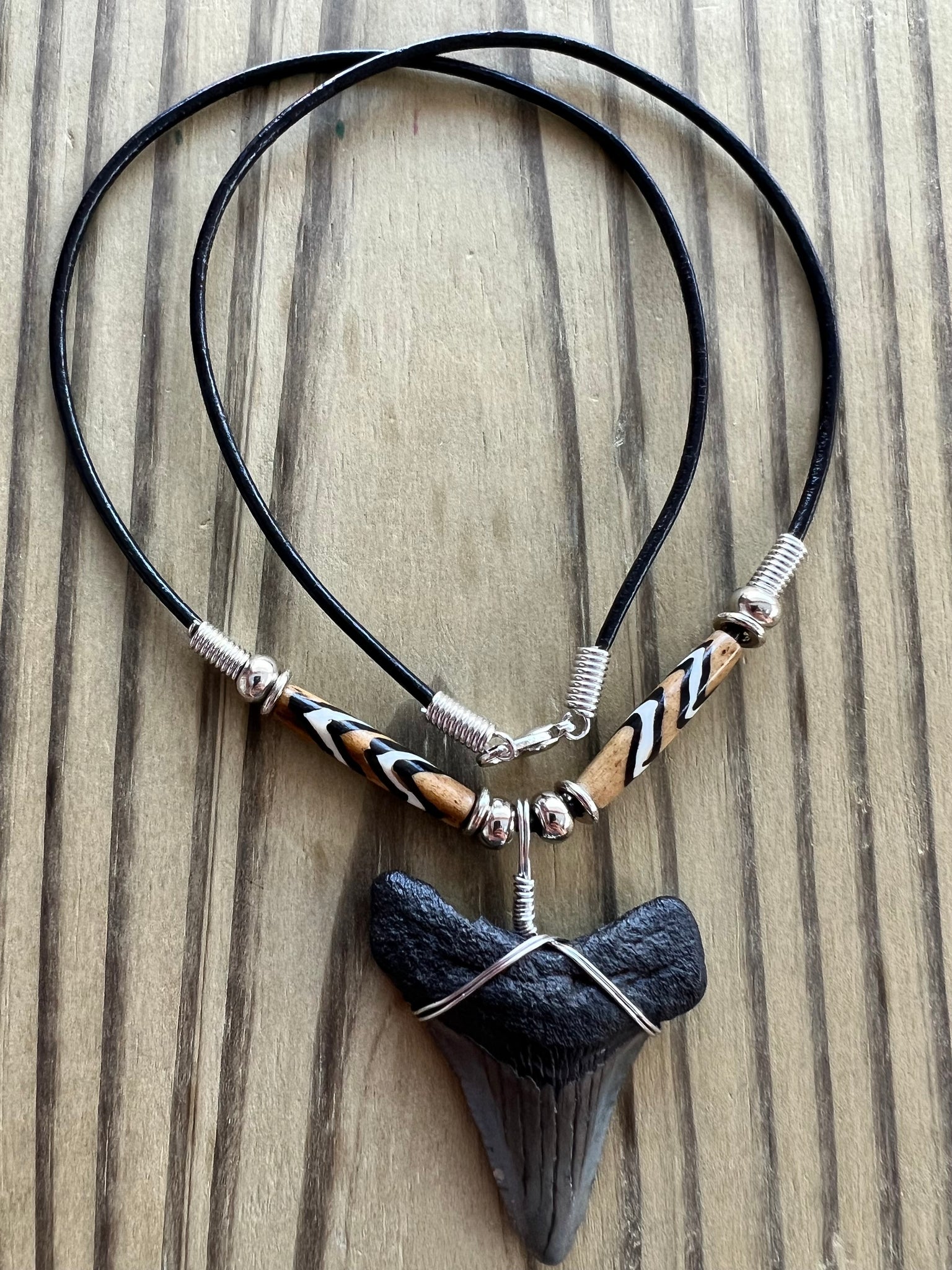 Finished on a black leather cord, the necklace sits comfortably and pairs easily with daily wear. It is a real fossil with authentic character, not a polished or manufactured imitation. This is the type of Megalodon tooth collectors choose for its shape, texture, and unmistakable prehistoric presence.