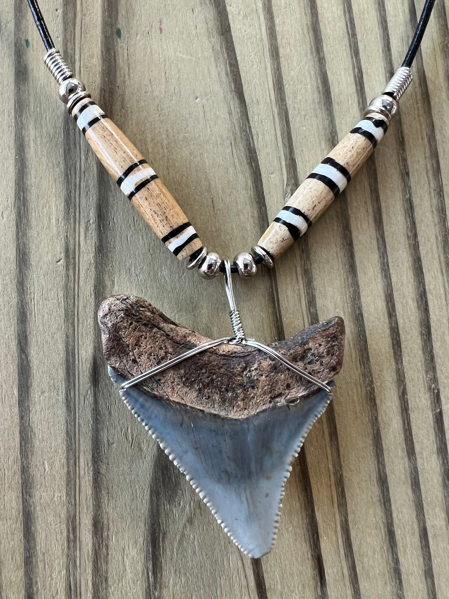 The hand carved bone beads were chosen specifically to match the fossil’s color palette, pairing light tan bone with black striping that reflects the tones found in the tooth’s root and blade. The fossil is wrapped securely in stainless steel wire and suspended on a black leather cord, creating a balanced design that keeps the attention on the tooth.