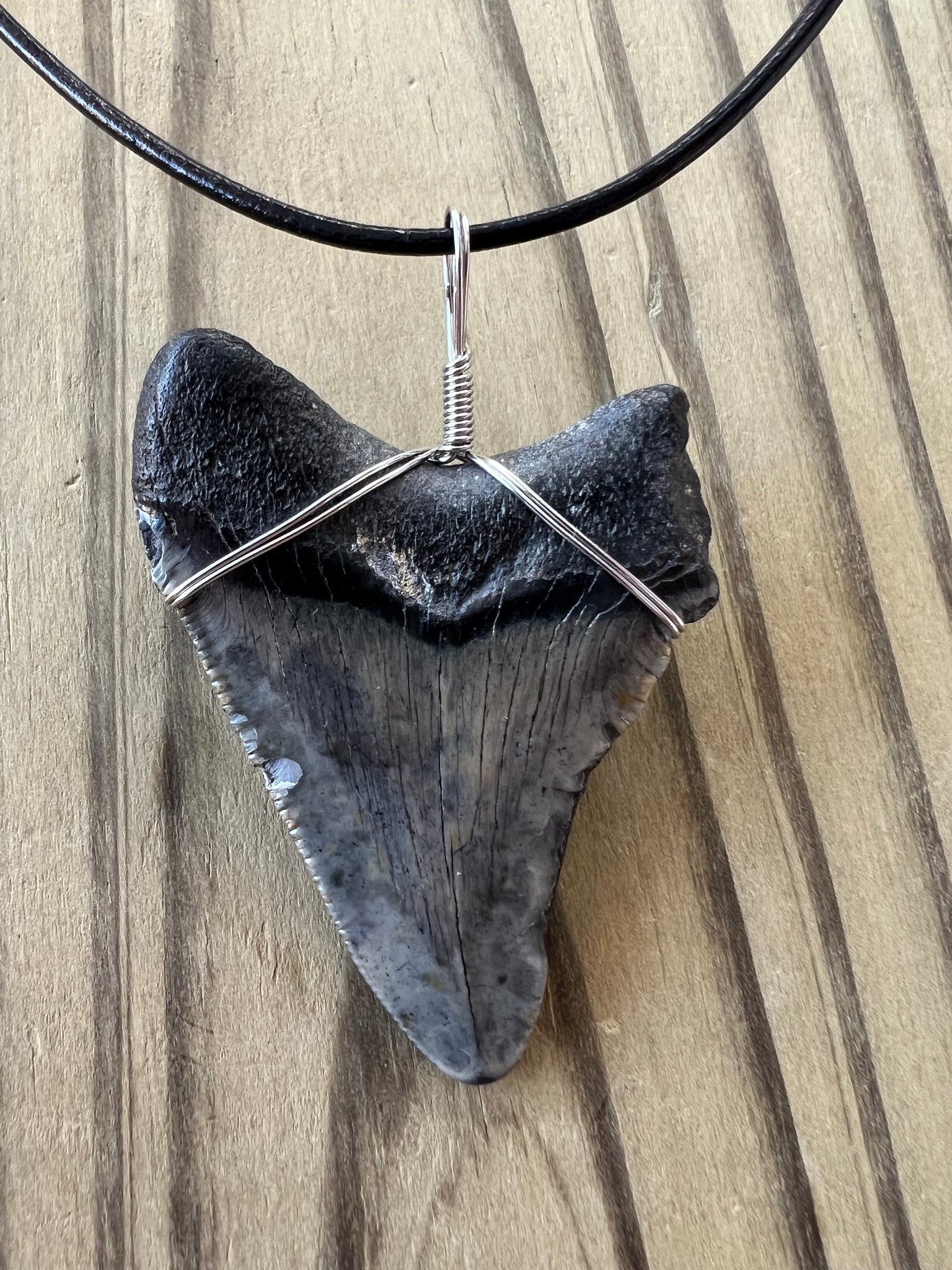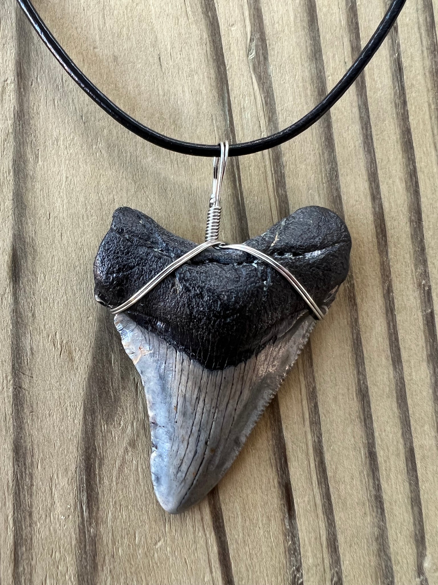 Gray and Black Fossil Megalodon Shark Tooth Necklace 2 1/4 Inch on Black Leather Cord